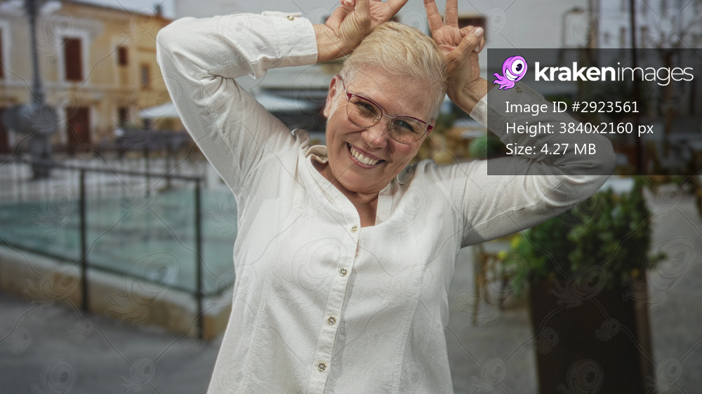 Woman with hands up making peace sign by head on a cobblestone street near outdoor cafe fountain, wearing glasses and white shirt, smiling; playful joy. - Kraken Images