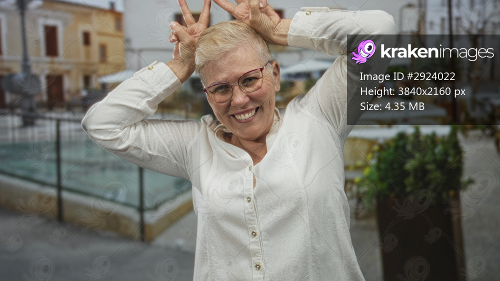 Woman with hands up making peace sign by head on a cobblestone street near outdoor cafe fountain, wearing glasses and white shirt, smiling; playful joy. - Kraken Images