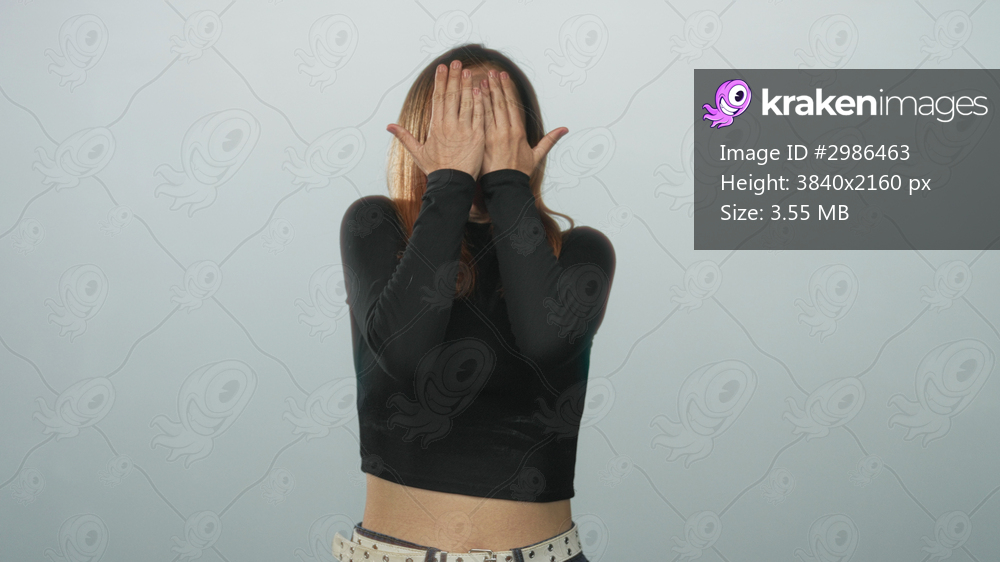 Woman with hands up, palms out pushing forward toward camera in studio, visible studded belt and cropped black top; fear and avoidance.