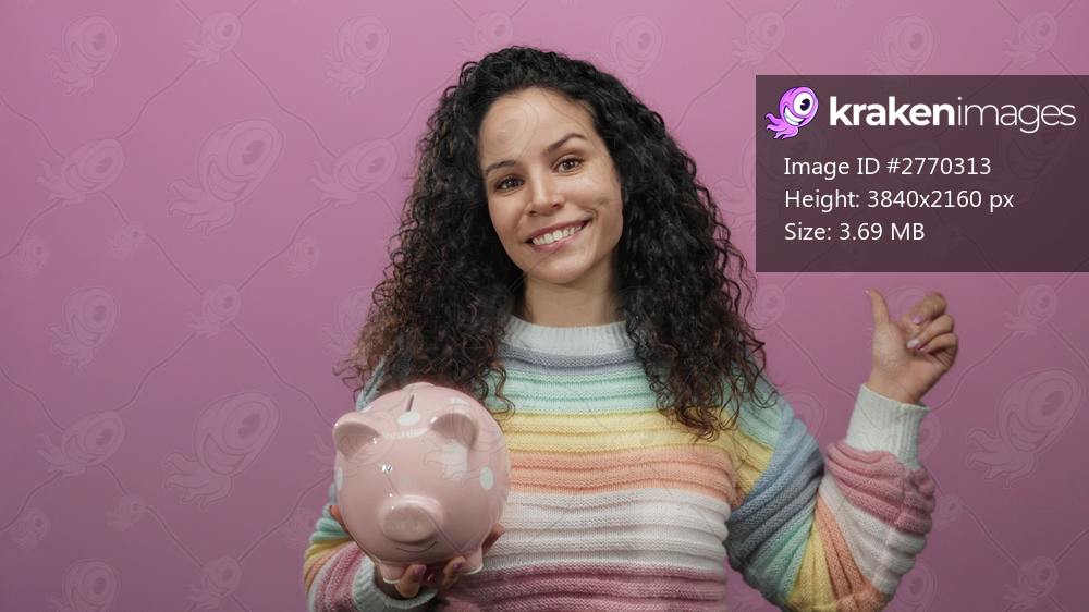 Woman happily points sideways holding a pink piggy bank against an isolated pink background, wearing a colorful striped sweater, symbolizing savings and financial planning. - Kraken Images