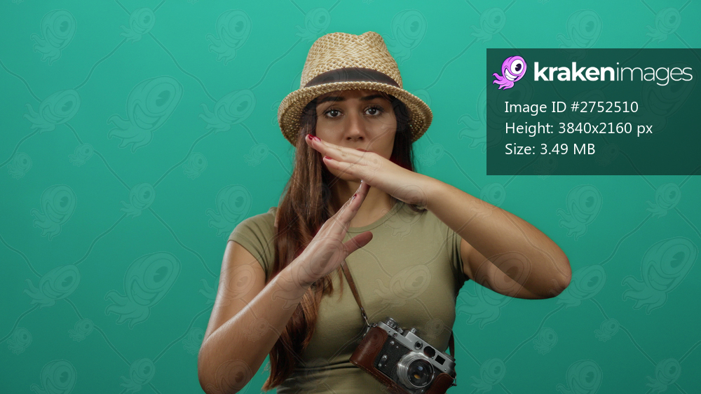 Woman with hat posing against a green background gesturing with a camera hanging around her neck as she gazes confidently at the viewer