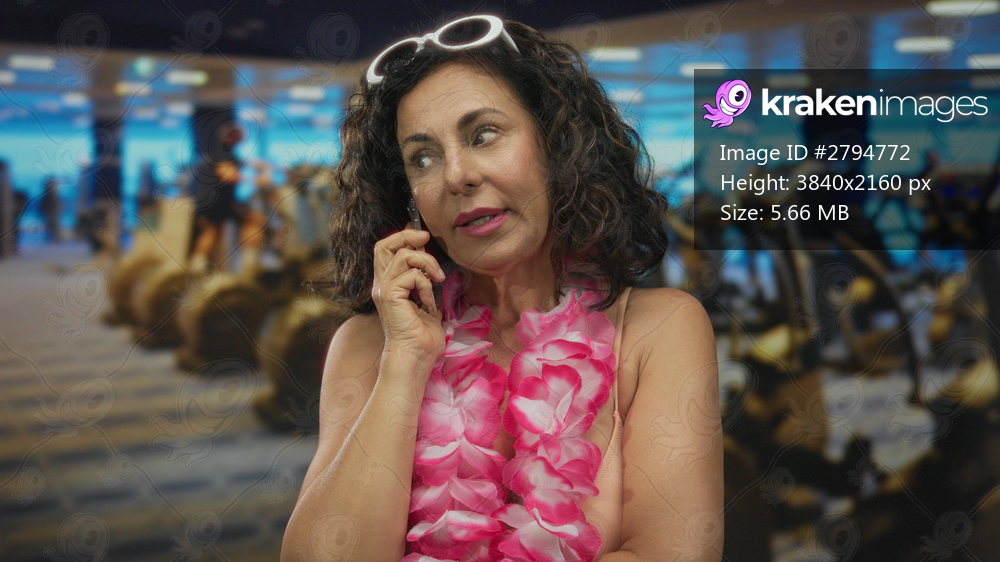 Woman with hawaiian lei talking on smartphone in gym, exhibiting joyful conversation amidst fitness equipment with vibrant floral accessory and sunglasses. - Kraken Images