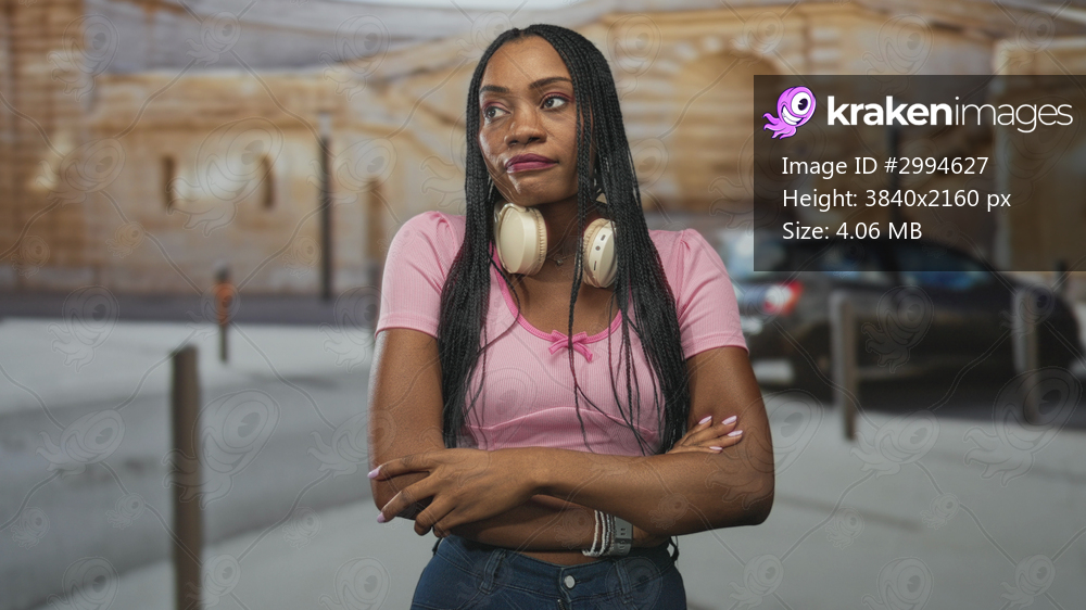Woman with headphones and arms crossed on a city street by a stone building, wearing pink top and braided hair; thoughtful resilience.