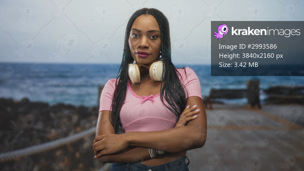 Woman with headphones and arms crossed on a pier wearing pink top and jeans, long braided hair visible; confidence resilience.