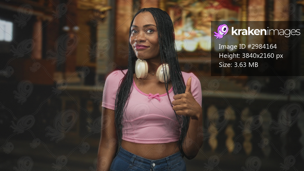 Woman with headphones around neck smiling and giving thumbs up, braided hair and pink crop shirt, standing in ornate church building with stained glass altar visible; confidence. - Kraken Images