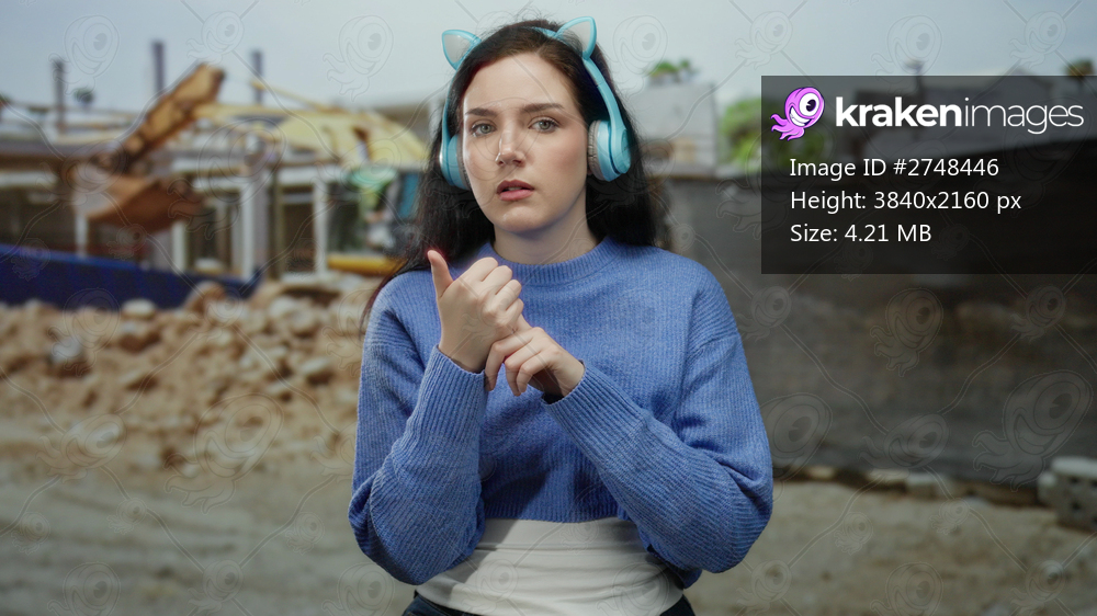 Woman with headphones counts on her fingers at a construction site, expressing focus and determination amidst the urban backdrop and machinery.