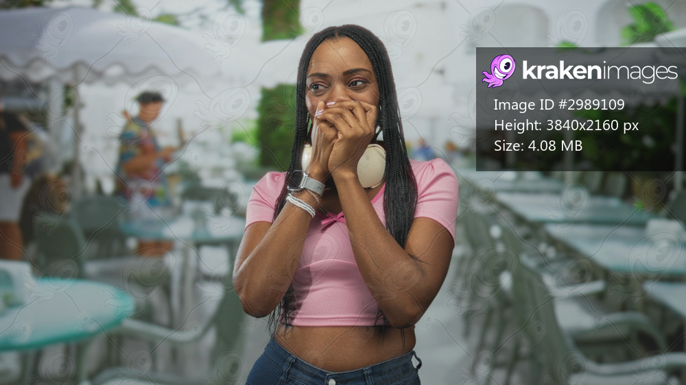 Woman with headphones covering mouth with hands and bare midriff in street cafe seating; surprise reaction memory.