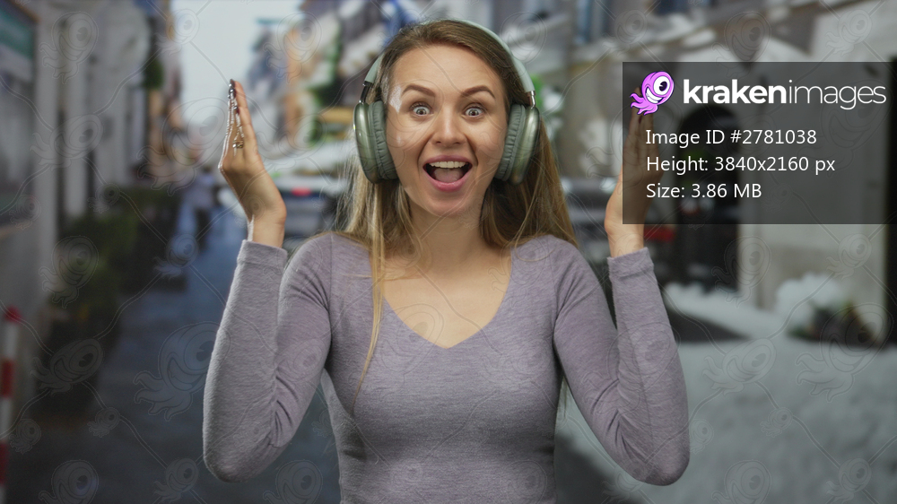 Woman with headphones excitedly covers face in lively urban street setting, capturing a young cheerful moment outdoors, exuding joy and surprise in a bustling city environment. - Kraken Images