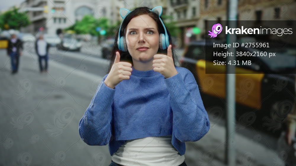 Woman with headphones gestures thumbs up on a busy street wearing a blue sweater, expressing emotion amidst an urban backdrop, blending style and technology outdoors. - Kraken Images