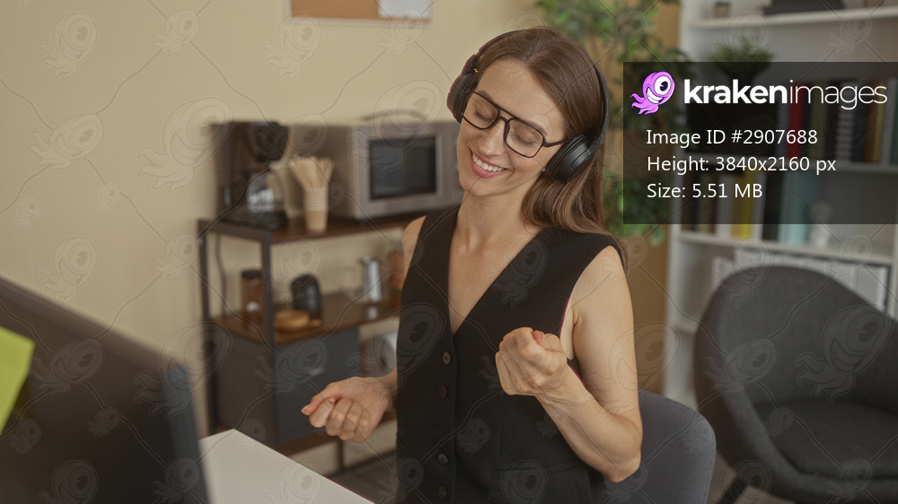 Woman with headphones holding smartphone and smiling at office desk; relaxation focus productivity calm.
