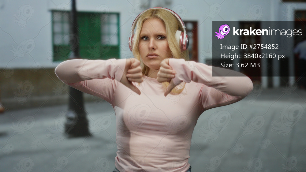 Woman with headphones outdoors making thumbs down gesture on a city street with blonde hair and pink clothing showing frustration or disagreement in an urban environment. - Kraken Images