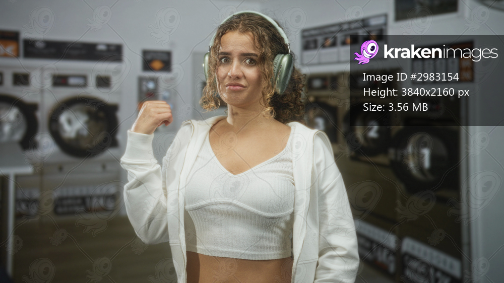 Woman with headphones raising fist near shoulder, curly hair, croptop and white hoodie in a laundromat building among industrial washers; confidence.