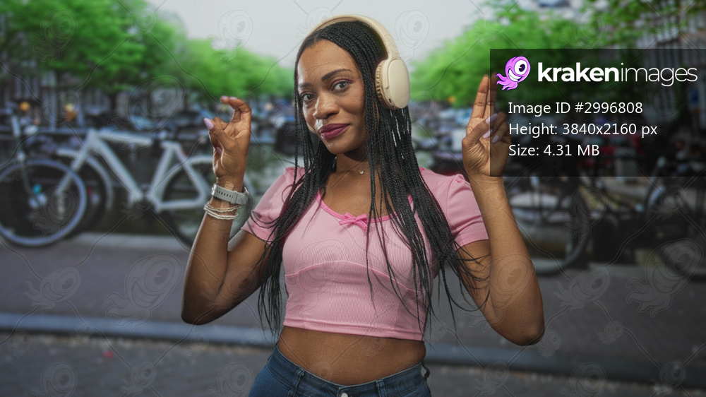 Woman with headphones showing peace signs with her fingers and bare midriff on a city street by a canal; joyful confidence.