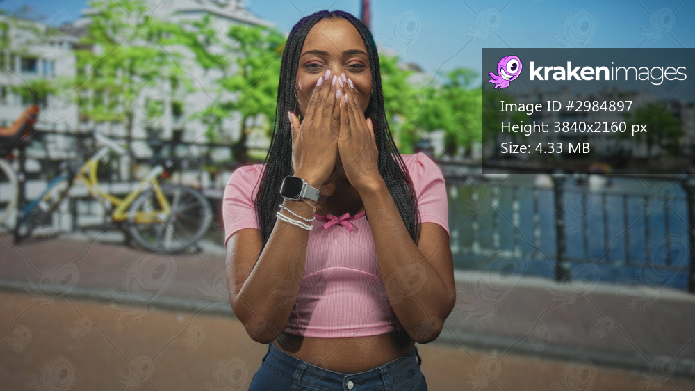 Woman with headphones smiling and exposed midriff on street by canal and bridge wearing a pink crop top; serenity leisure.