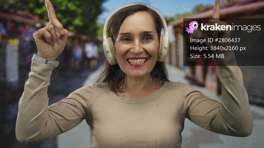 Woman with headphones smiling on city street surrounded by market stalls, exuding joy and energy in a bustling outdoor urban environment, pointing upwards energetically. - Kraken Images