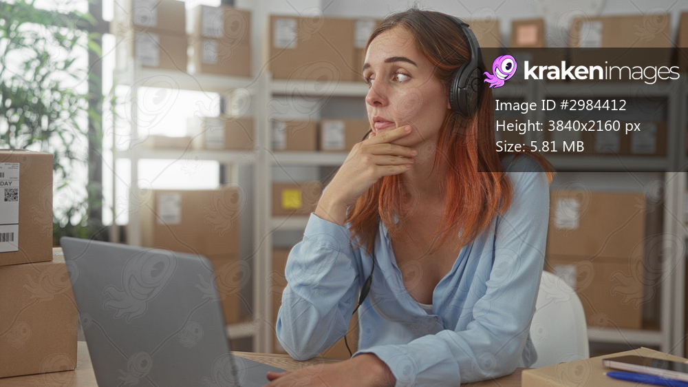 Woman with headset covering mouth with hand over laptop among packed boxes in a storage building; stress overwhelm.