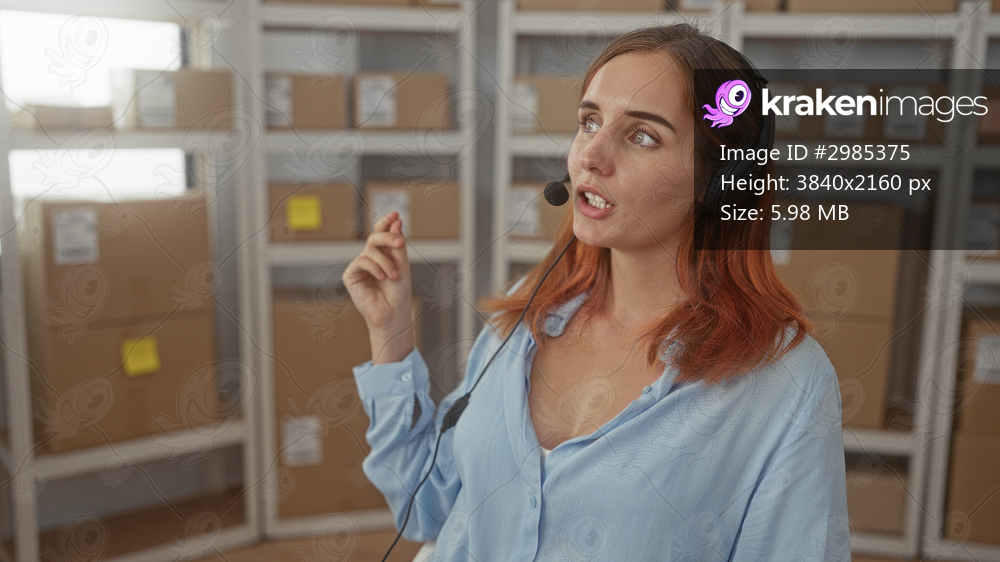 Woman with headset pointing finger and speaking with open mouth among cardboard boxes on metal shelves in warehouse; professionalism customer service.