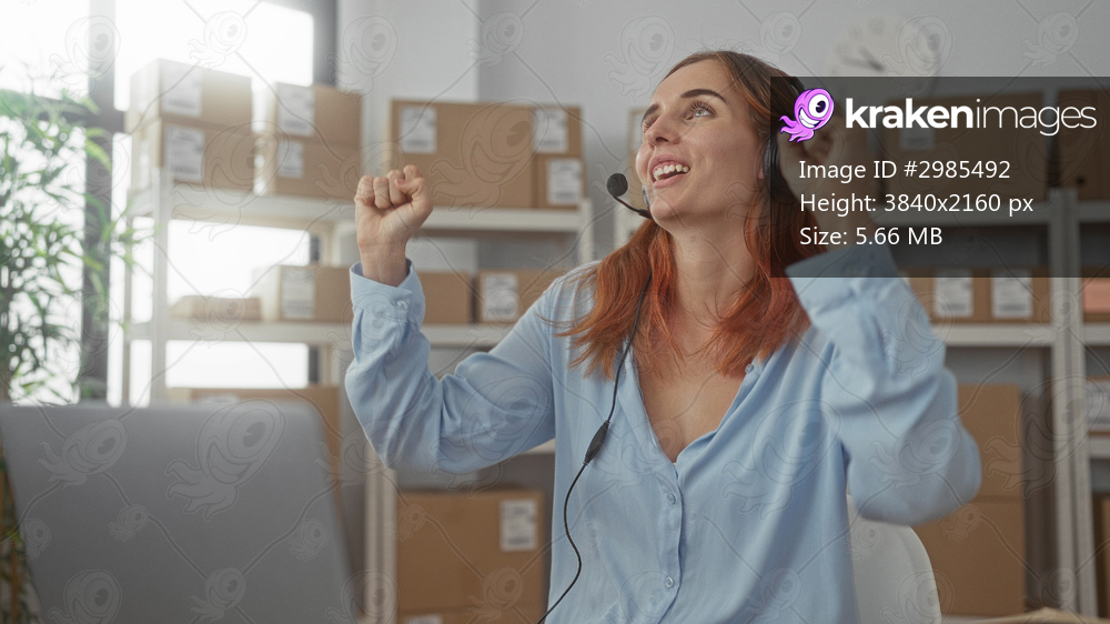 Woman with headset raising fists in celebration inside a warehouse filled with cardboard boxes; small business success joy.