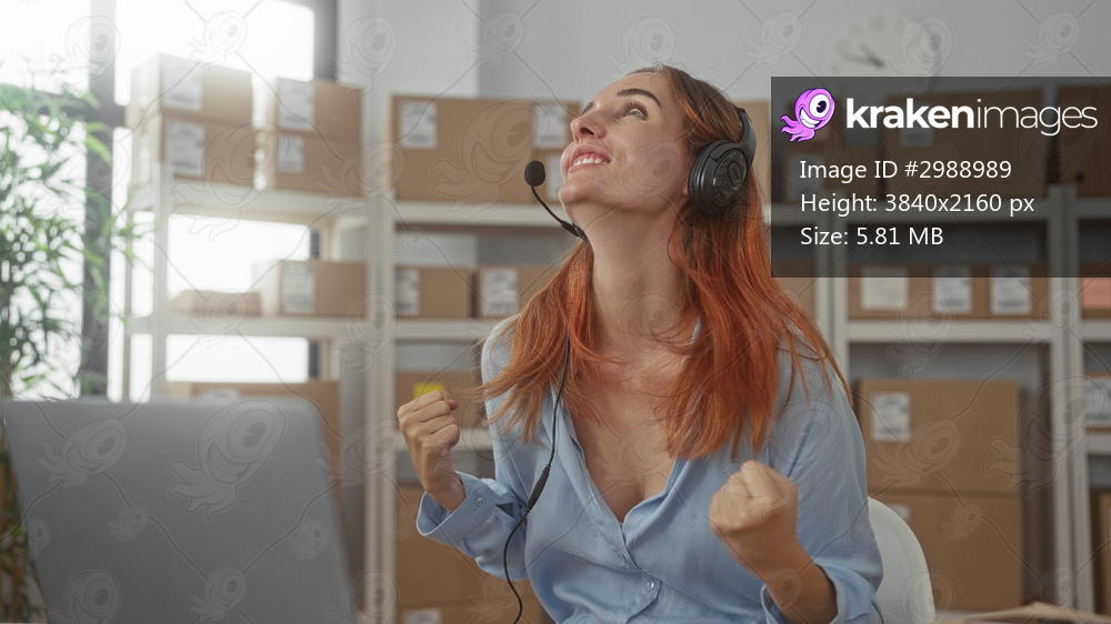 Woman with headset raising fists in celebration inside a warehouse filled with cardboard boxes; small business success joy.