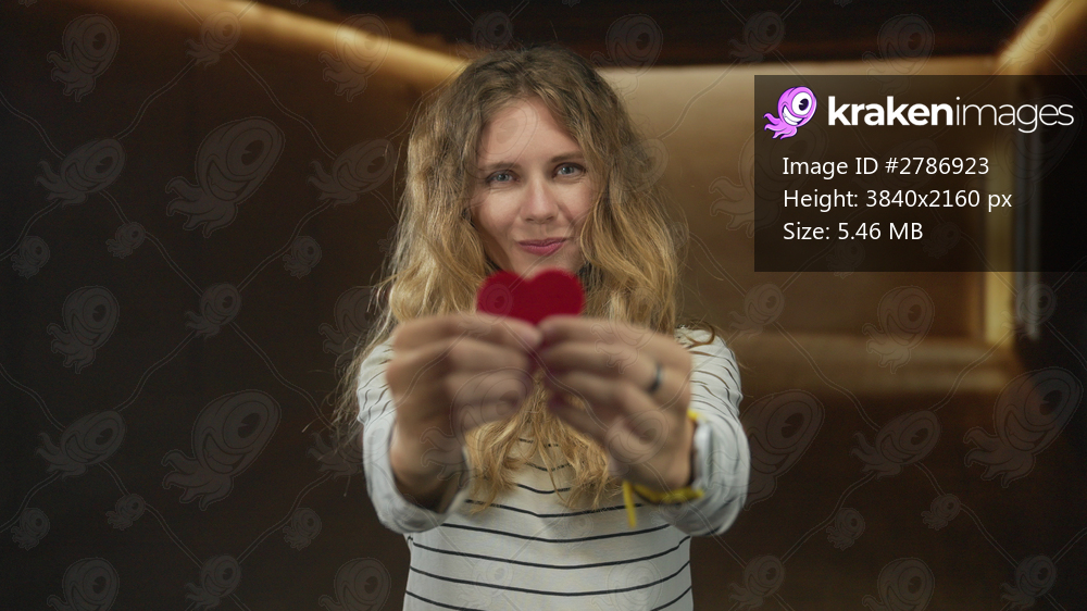 Woman heart holding studio blonde young smiling red paper offering gesture.
