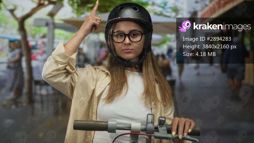 Woman with helmet and glasses points finger while holding electric scooter handlebars on street; confidence commute.