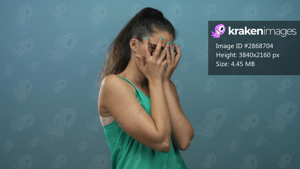 Woman hides sunglasses and face behind hands showing turquoise nails wearing green top in blue studio; shyness.