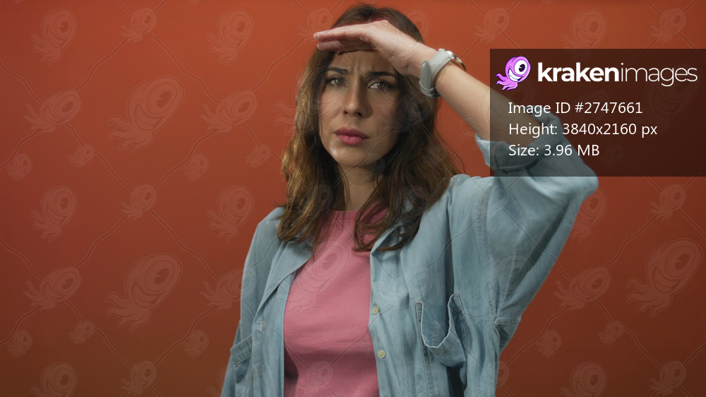 Woman with hispanic background gazes into distance over isolated red backdrop, wearing casual style with watch and denim, conveying curiosity and contemplation. - Kraken Images
