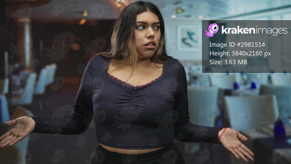 Woman hispanic curvy shrugs with open palms and puzzled expression in restaurant dining building with visible tables and chairs; confusion.