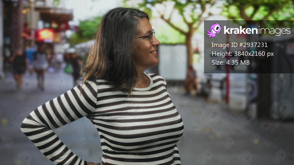 Woman hispanic middle age brunette with glasses and striped top, smiling with arms crossed on a busy street; confidence casual.