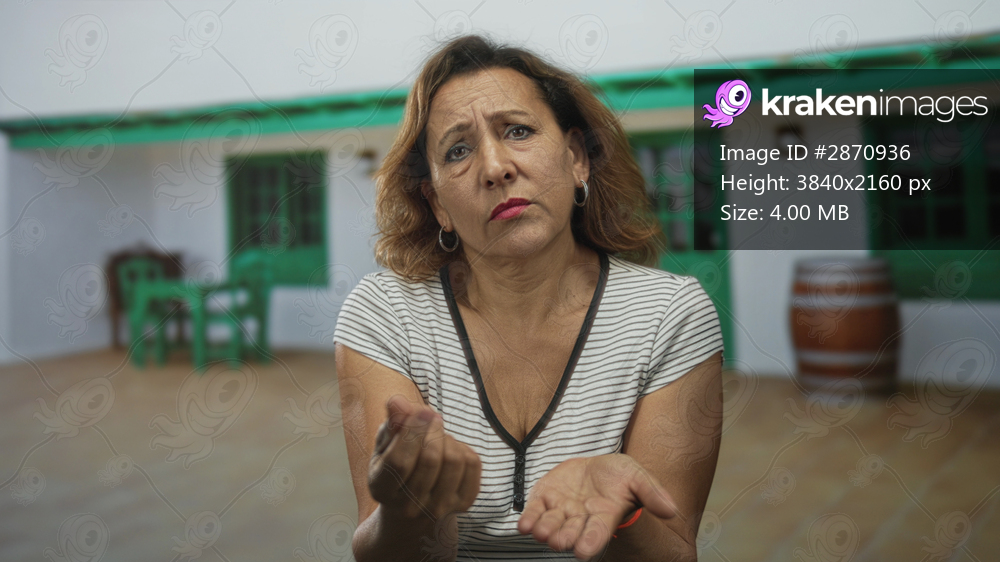 Woman hispanic middle age holds out open palms asking for money in front of a white building with green doors; financial need pleading.