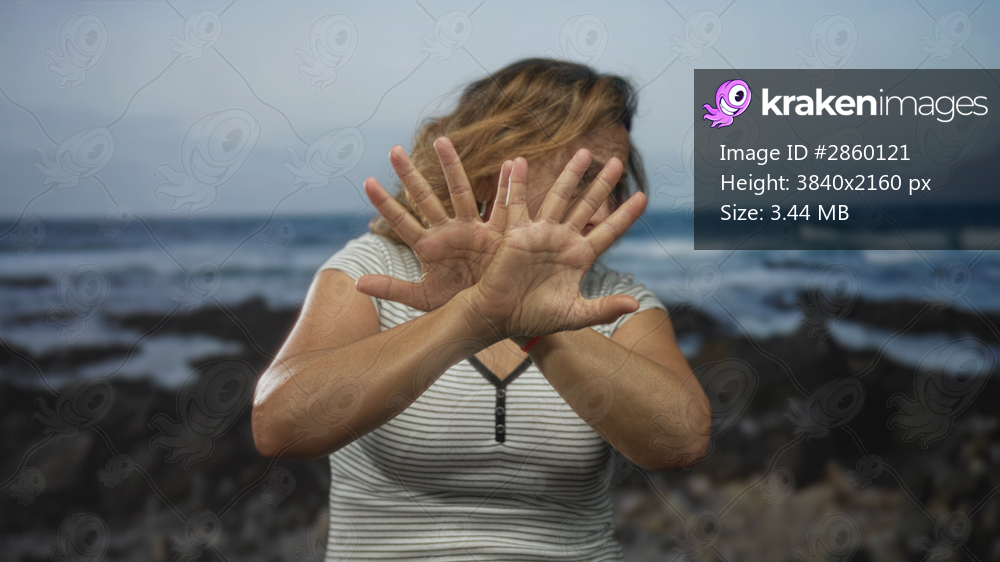 Woman hispanic middle age wearing striped shirt holds up crossed palms shielding face in studio setting with soft focus lighting; rejection defiance resistance. - Kraken Images