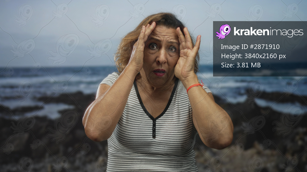 Woman hispanic middle age wearing striped shirt holds up crossed palms shielding face in studio setting with soft focus lighting; rejection defiance resistance. - Kraken Images