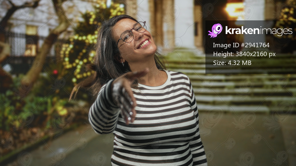Woman hispanic middle aged brunette reaches out hand toward camera at building entrance, smiling and offering handshake while wearing striped top and glasses; warm welcome. - Kraken Images