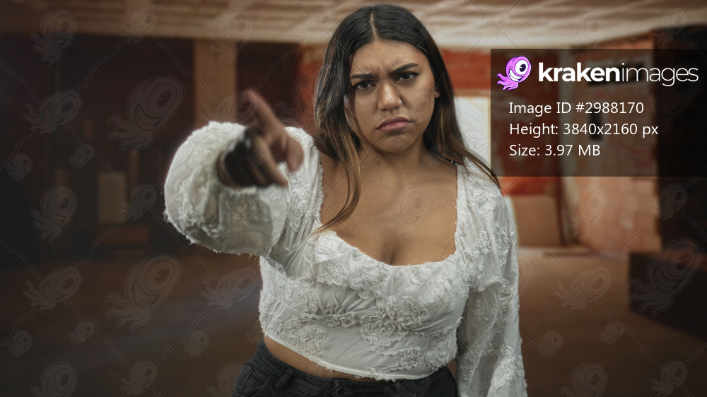 Woman hispanic plus size points finger at camera and touches temple with finger in unfinished building interior wearing white blouse; frustration defiance. - Kraken Images