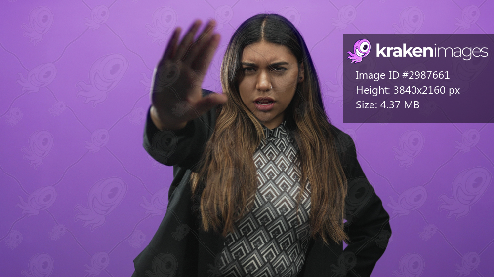 Woman hispanic plus size with raised hand showing palm out stop gesture in studio purple backdrop wearing patterned top and black jacket; defiance anger. - Kraken Images
