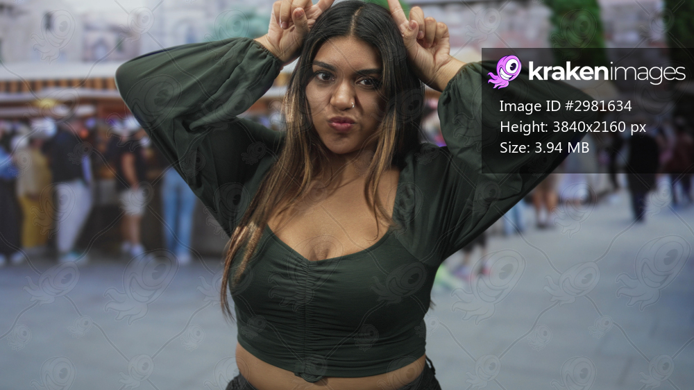 Woman hispanic plus size showing cleavage and midriff, hands to head making bunny ears on crowded street market with vendors and blurred building facades; playful confidence. - Kraken Images