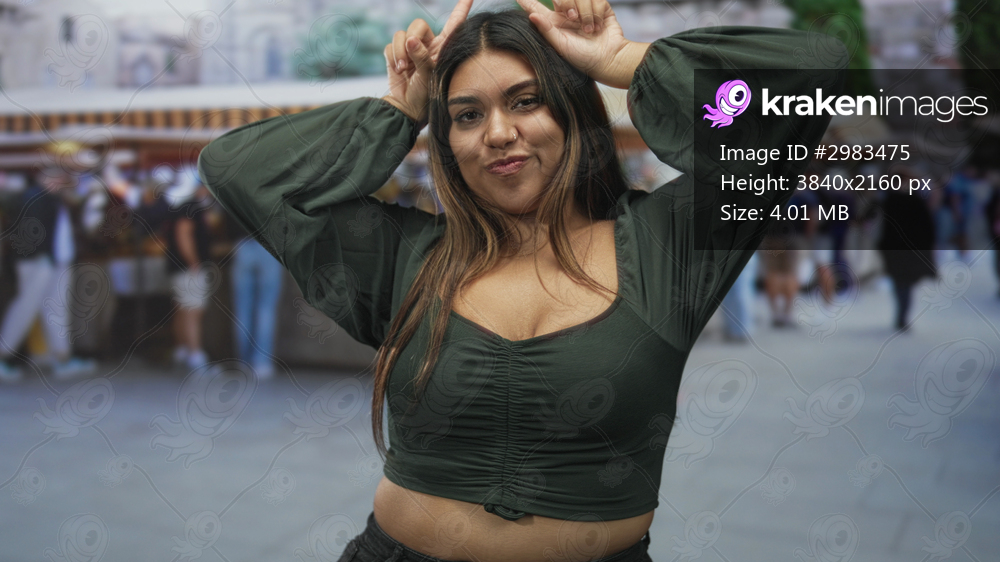 Woman hispanic plus size showing cleavage and midriff, hands to head making bunny ears on crowded street market with vendors and blurred building facades; playful confidence. - Kraken Images
