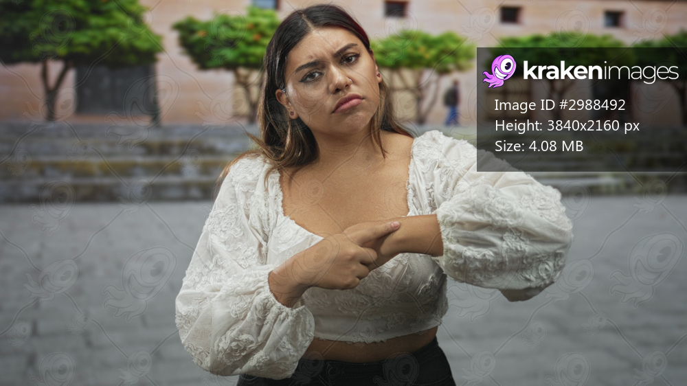 Woman hispanic plus size shrugging with palms up showing bare hands on a city street in front of building steps and trees; annoyance.