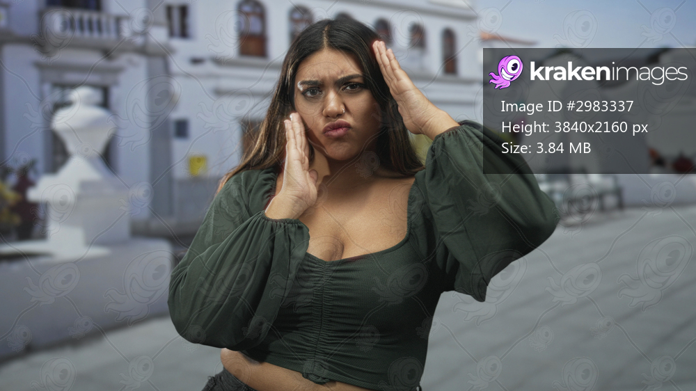 Woman hispanic plus size touching temples and brushing hair while wearing green blouse and cropped top on white stucco street; headache discomfort.