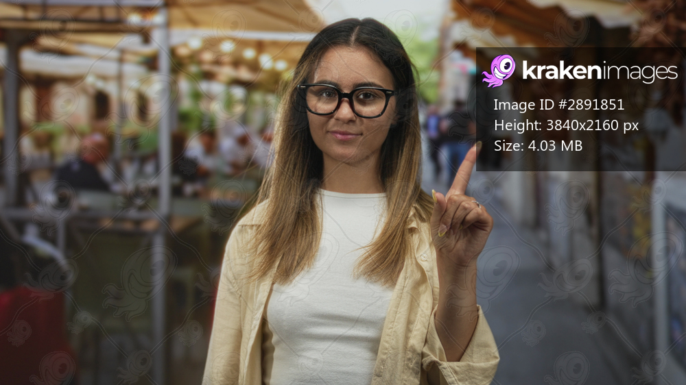 Woman hispanic teenager pointing index finger up at outdoor restaurant terrace, wearing glasses and light jacket; instruction confidence.