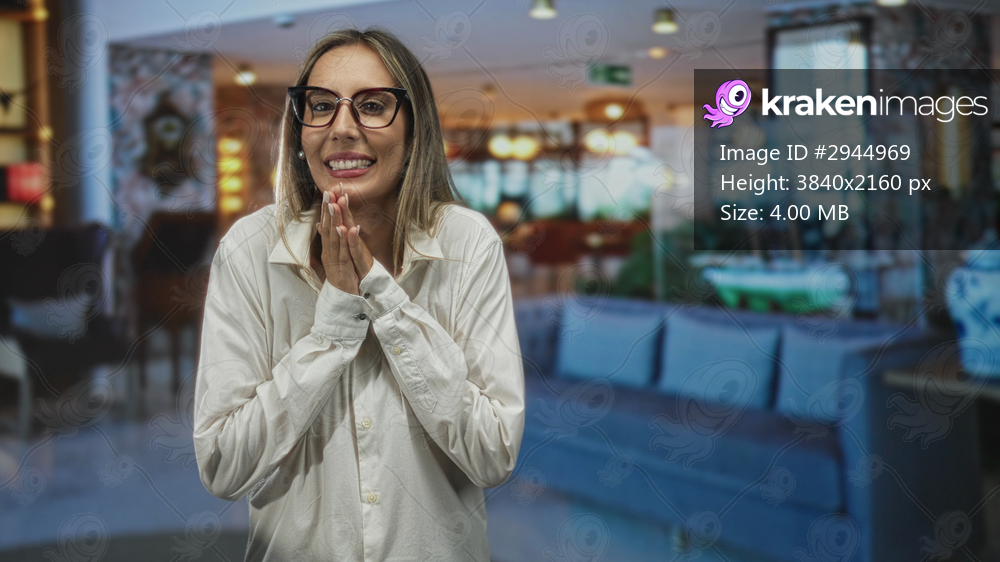 Woman hispanic young blonde clasping hands near face in hotel building lobby, smiling with glasses and white shirt and pearl earring; hope.