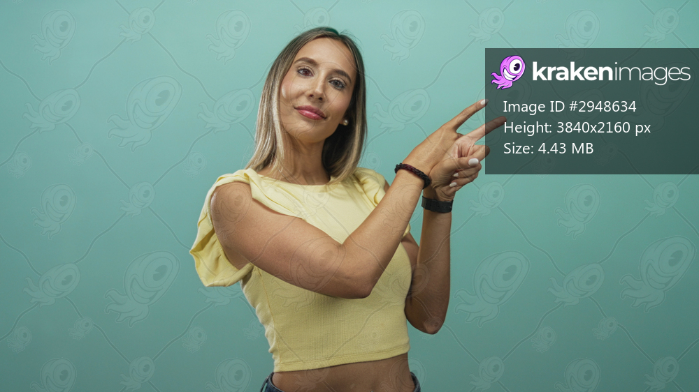 Woman hispanic young blonde in yellow crop top pointing fingers with visible hands and forearms in teal studio; confidence.