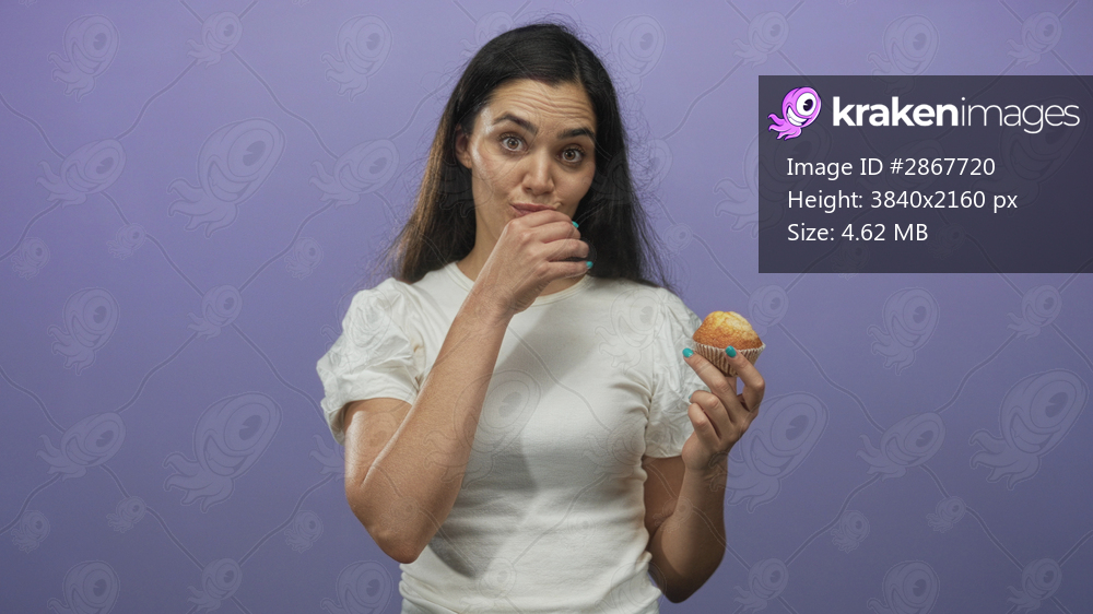 Woman hispanic young holding a muffin, finger to lips for silence in studio with purple backdrop and white tee; temptation diet.