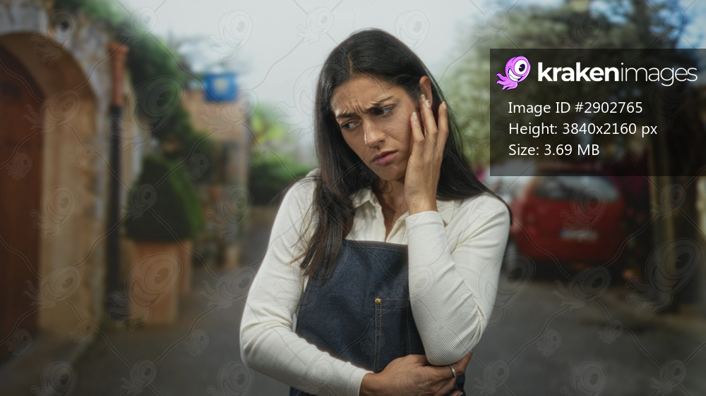 Woman hispanic young holding hand to cheek on a narrow street wearing denim apron with furrowed brow and arm across chest; pain help.