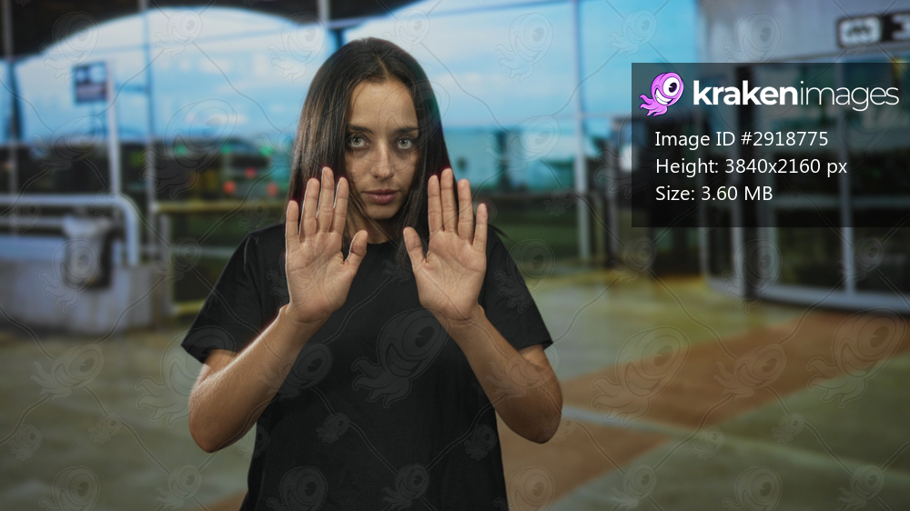 Woman hispanic young wearing black t shirt holds both palms up toward camera at airport terminal entrance with direct gaze; caution.