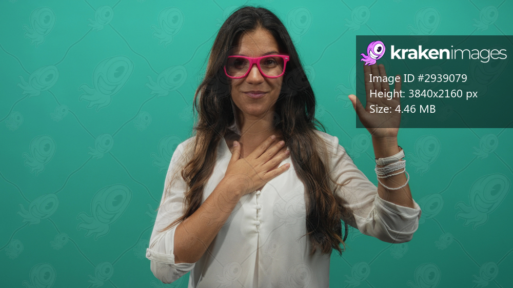 Woman hispanic young wearing pink glasses and white blouse, hand on chest and right hand raised in teal studio; sincere pledge.
