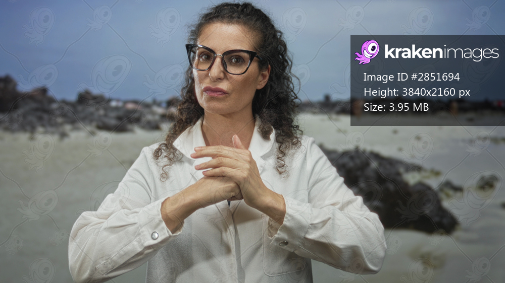 Woman hits her palm with a clenched fist on a sandy beach in a fight gesture showing bare hands; determination.