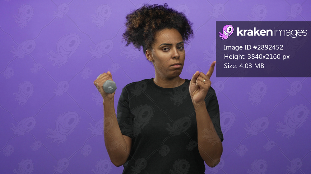 Woman holding 1kg dumbbell and pointing finger at weight in studio purple backdrop; determination strength.