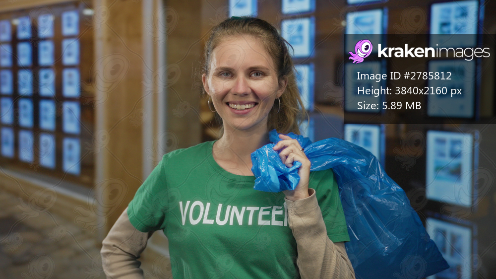 Woman holding a bag and smiling while participating in a cleanup event, blonde young volunteer carrying a plastic charity item in an indoor setting.