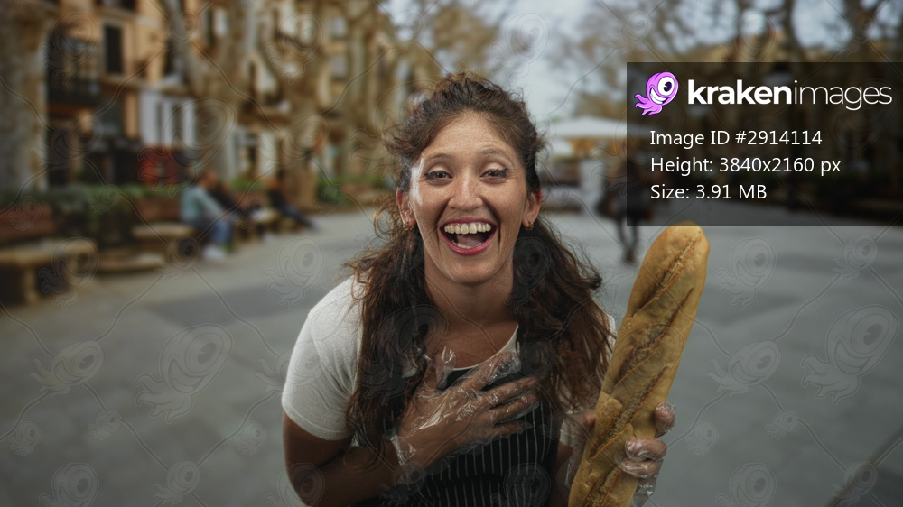 Woman holding a baguette and wearing apron and plastic gloves on a bustling street park with benches and trees; local bakery joy.